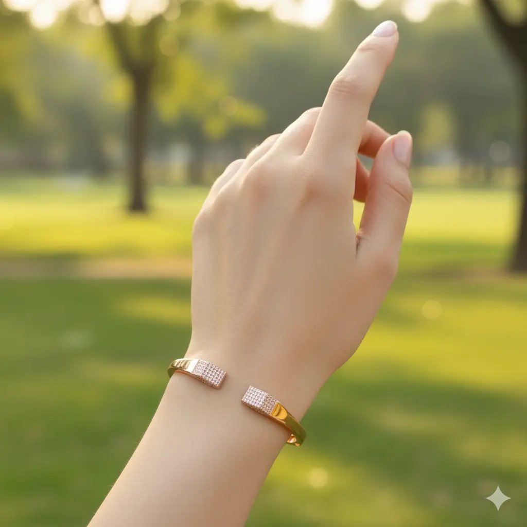 The Aura Cuff Bracelet is a modern take on traditional kada-style bracelets, reimagined for today’s fashion-forward crowd. Designed in a classic cuff shape, this bracelet features premium-quality zircons carefully studded on both open ends. Each stone reflects elegance, adding sparkle and sophistication to your look without overwhelming your style.