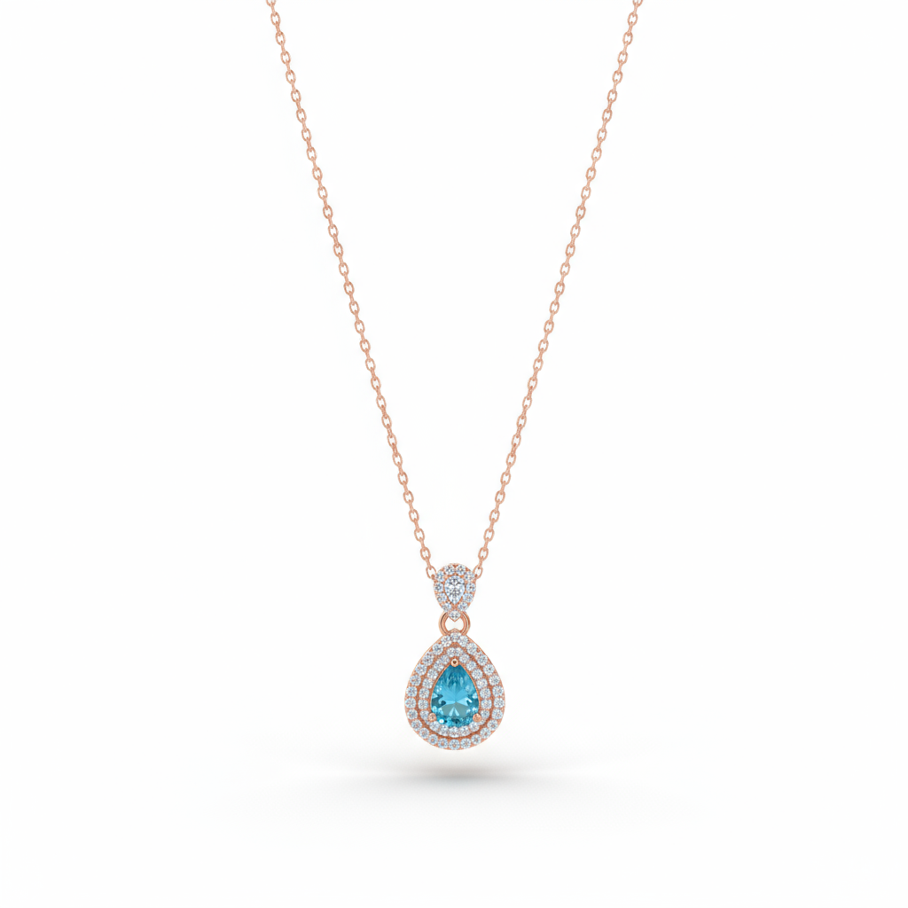 Rose gold pendant chain featuring a striking blue teardrop stone, accentuated with zircons and bold solitaires.