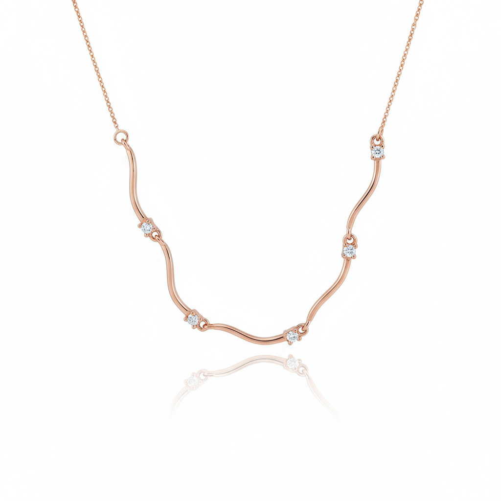 The Celestial Curve Necklace in sterling silver is designed to flow like a gentle wave, capturing the fluid grace of celestial motion. Finished in elegant rose gold, this minimal piece features alternating zircon-studded segments for a subtle sparkle that flatters all necklines.