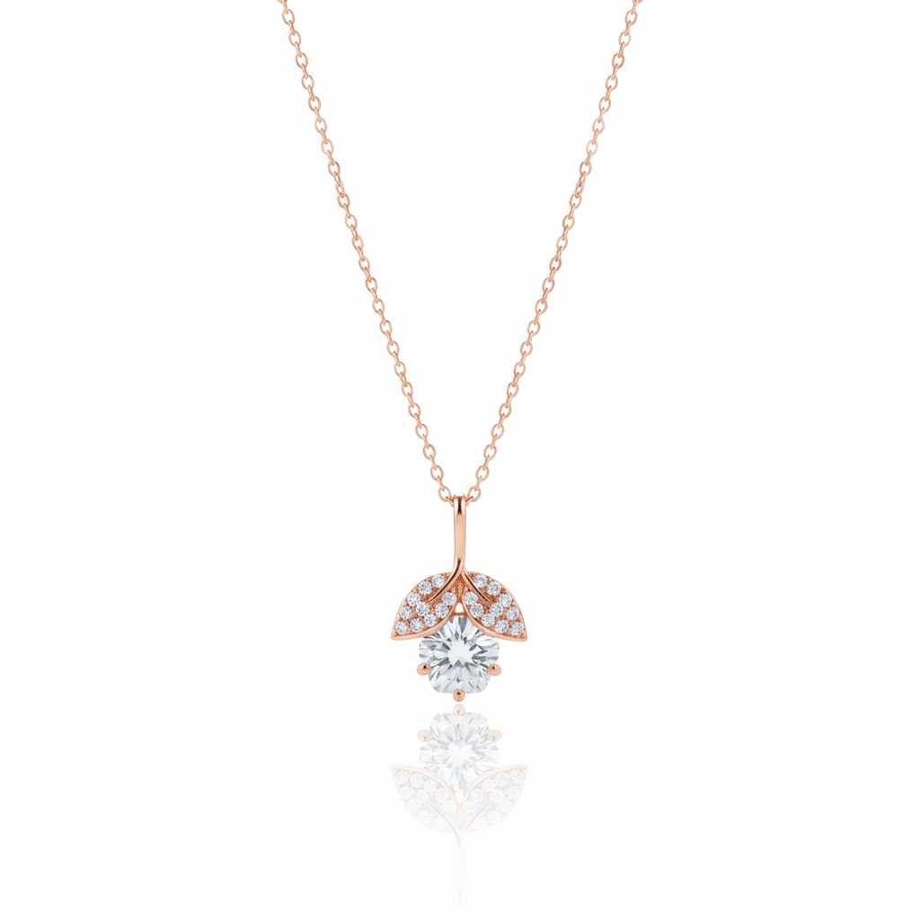 Minimal rose gold pendant chain in sterling silver featuring an inverted bud design with two zircon-studded petals and a central round crystal. Tarnish-resistant, can be repolished with any goldsmith. A good silver gifting option.