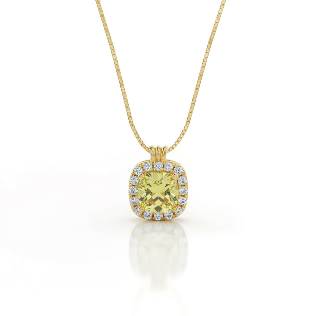 Gold finish cushion cut green pendant chain in sterling silver, surrounded by premium zircons.