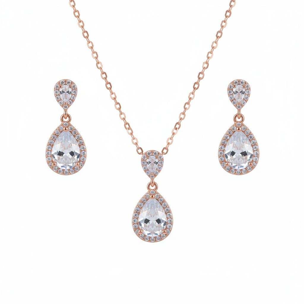 Teardrop-shaped pendant and earrings in rose gold 925 sterling silver, adorned with zircon accents. A delicate, timeless gifting option.