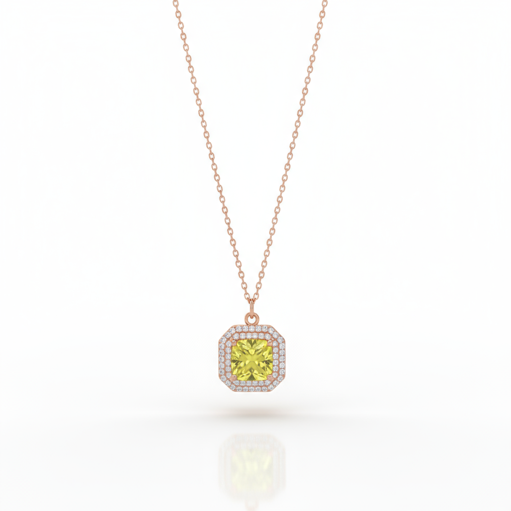 A classic rose gold pendant chain featuring a square emerald-green stone bordered with fine zircons. Timeless and elegant.