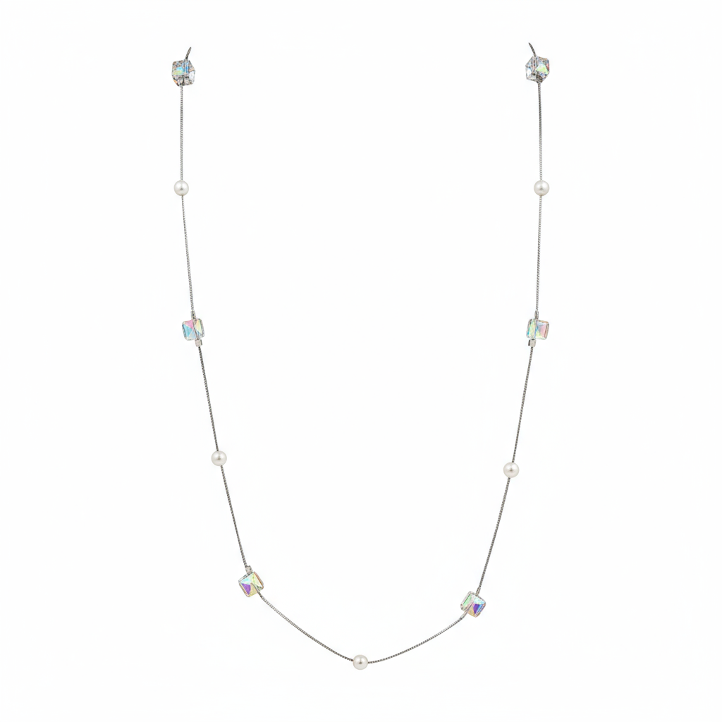 Make a refined statement with our Ice Cube Pearl Necklace in 925 Sterling Silver, crafted in a silver polish for a timeless and versatile look. The necklace features ice cube–shaped crystals arranged along the chain, interspersed with elegant pearl accents, creating a delicate play of light and texture.