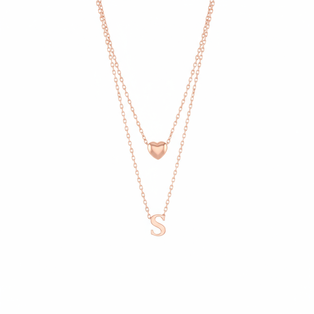Dual-layer rose gold necklace with a heart charm on one layer and an alphabet letter pendant on the other. A perfect mix of style and personalization.