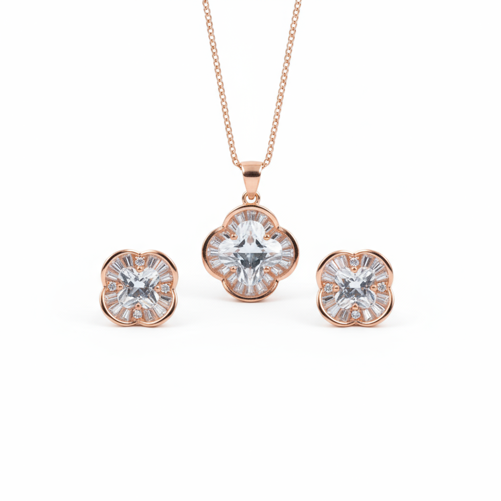 Floral crystal pendant and earrings in rose gold 925 sterling silver with stone detailing and a minimal chain — ideal for gifting and everyday elegance.