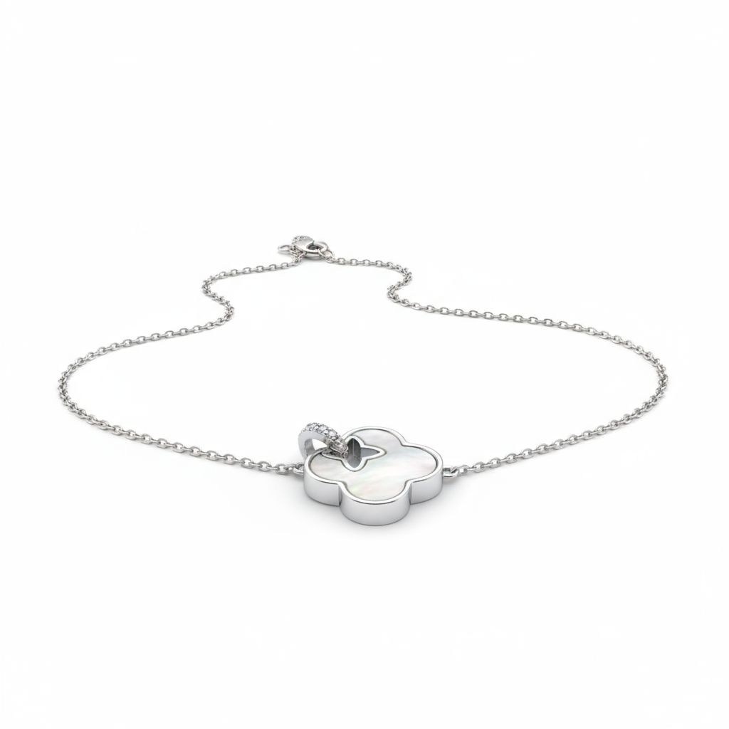 The Lucky Charm Mother of Pearl Pendant Chain in Sterling Silver is a beautifully crafted piece symbolizing elegance and good fortune. Featuring a clover-shaped design filled with radiant mother of pearl and bordered with sparkling zircons, this pendant is finished in classic silver and comes with a matching chain. Its delicate charm and meaningful shape make it ideal for daily wear, special occasions, or as a thoughtful silver gifting option. Add a touch of luck and luxury to your collection with this graceful piece. Our designs are inspired by Silver jewellery trends from premium brands like Giva and Palmonas.