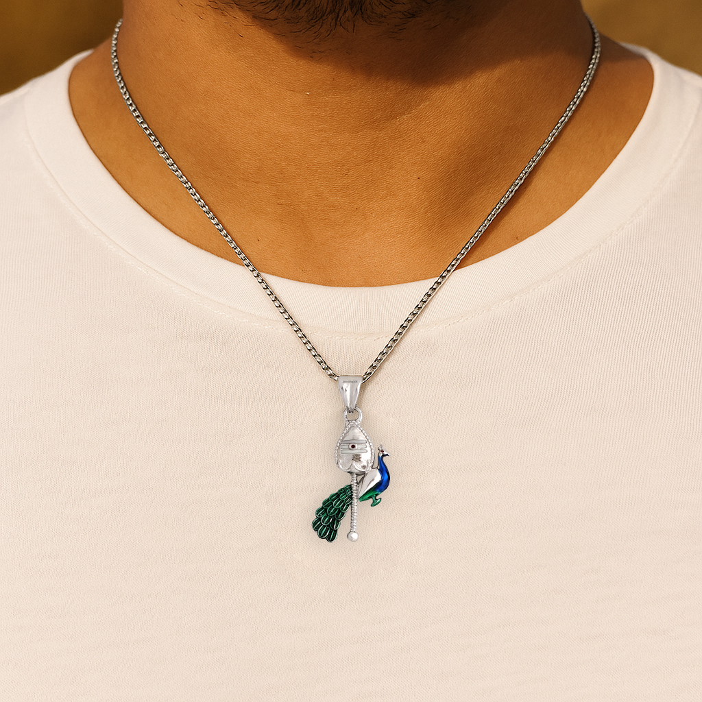 The peacock is crafted with green and blue enamel accents, capturing its vibrant feathers in fine detail. Together with the vel, the pendant symbolizes strength, protection, and spiritual clarity, making it ideal for anyone seeking divine guidance and warding off negativity.