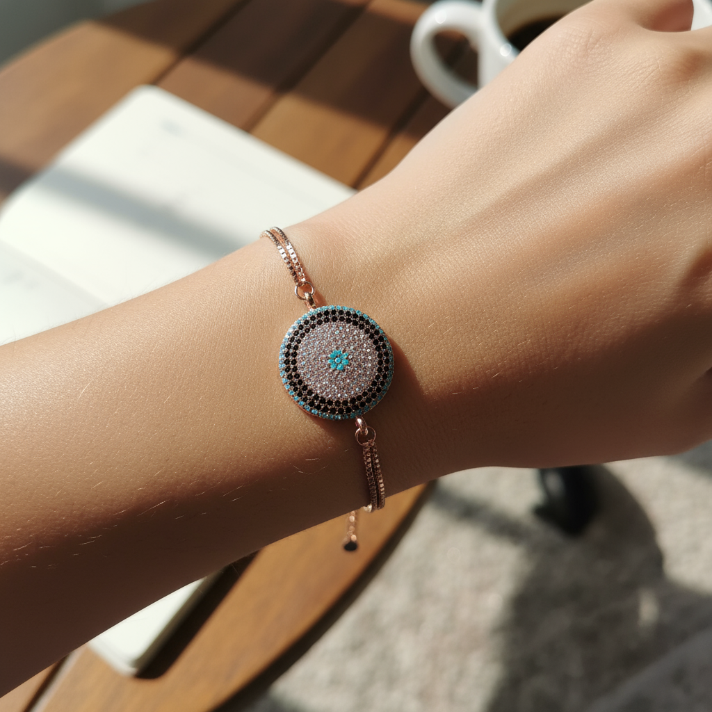 The Mystic Evil Eye Bracelet is a bold interpretation of traditional protection jewelry, blending symbolism with modern elegance. At its heart lies a large, circular evil eye design crafted from blue, black, and white cubic zircons—believed to guard against negativity and envy.