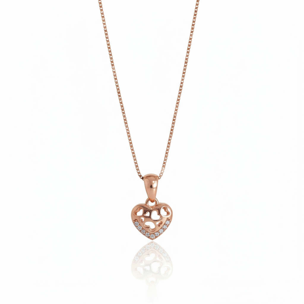 A charming rose gold heart pendant featuring nested heart-shaped cutouts and a row of sparkling zircons, paired with a sleek sterling silver chain.