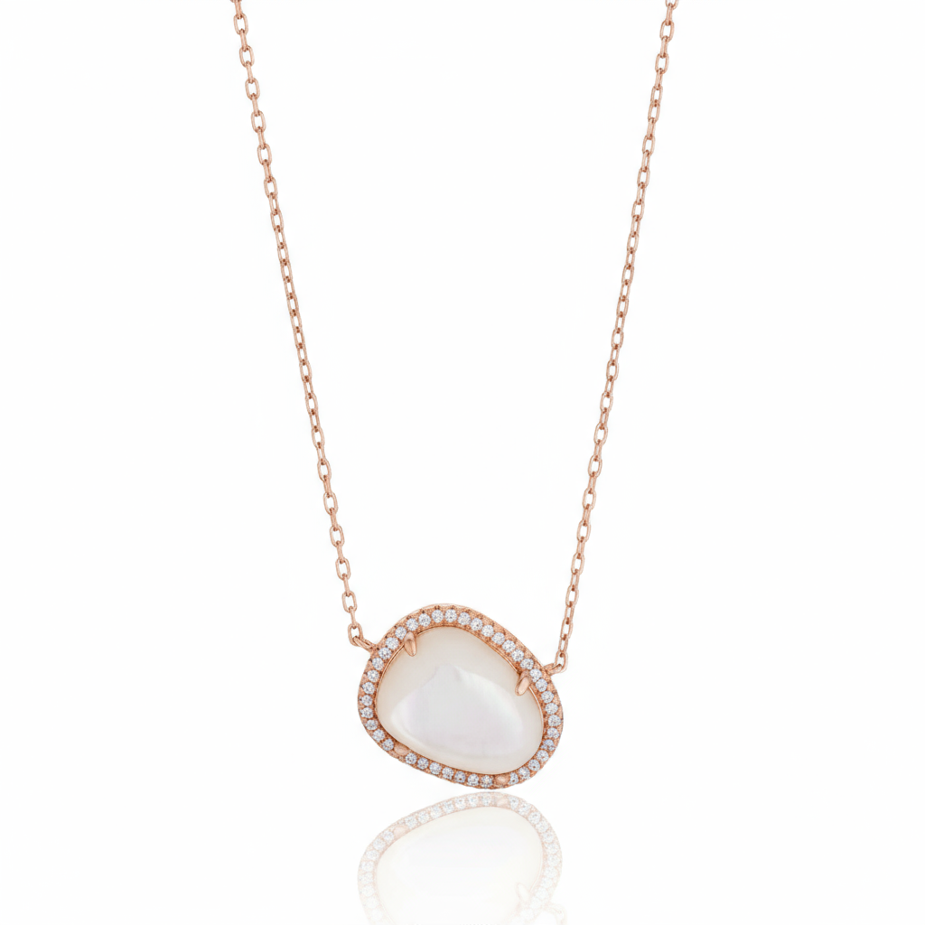 Introducing the Moonstone Pendant Chain in 925 sterling silver — a modern interpretation of elegance. The open, slightly abstract circle design with a stone is studded with fine cubic zircons, forming a subtle shimmer that catches the eye without overpowering your look. The warm rose gold finish adds a soft glow, making it an ideal piece for both daily wear and special occasions.
