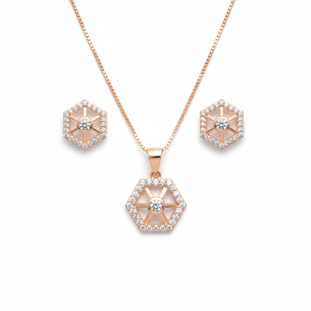 925 sterling silver rose gold pendant set with earrings and chain. Available in floral, heart, and geometric styles. Minimal yet striking—great for silver gifting.