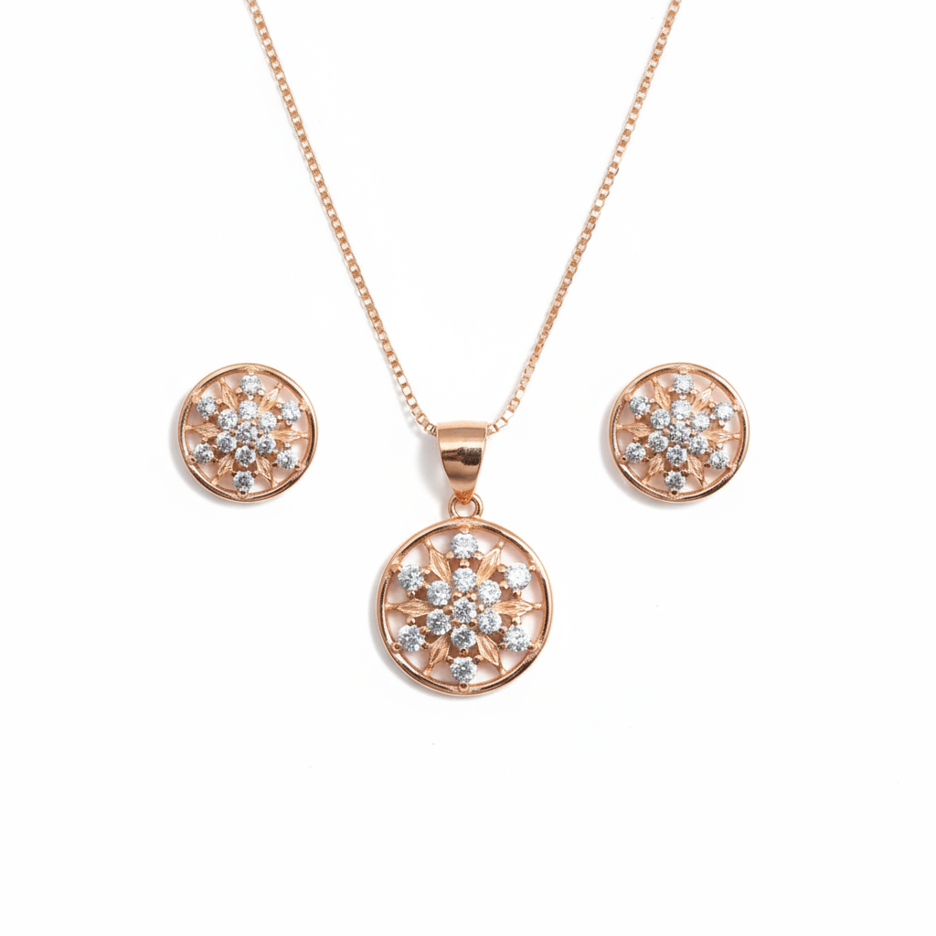 925 sterling silver rose gold pendant set with earrings and chain. Available in floral, heart, and geometric styles. Minimal yet striking—great for silver gifting.