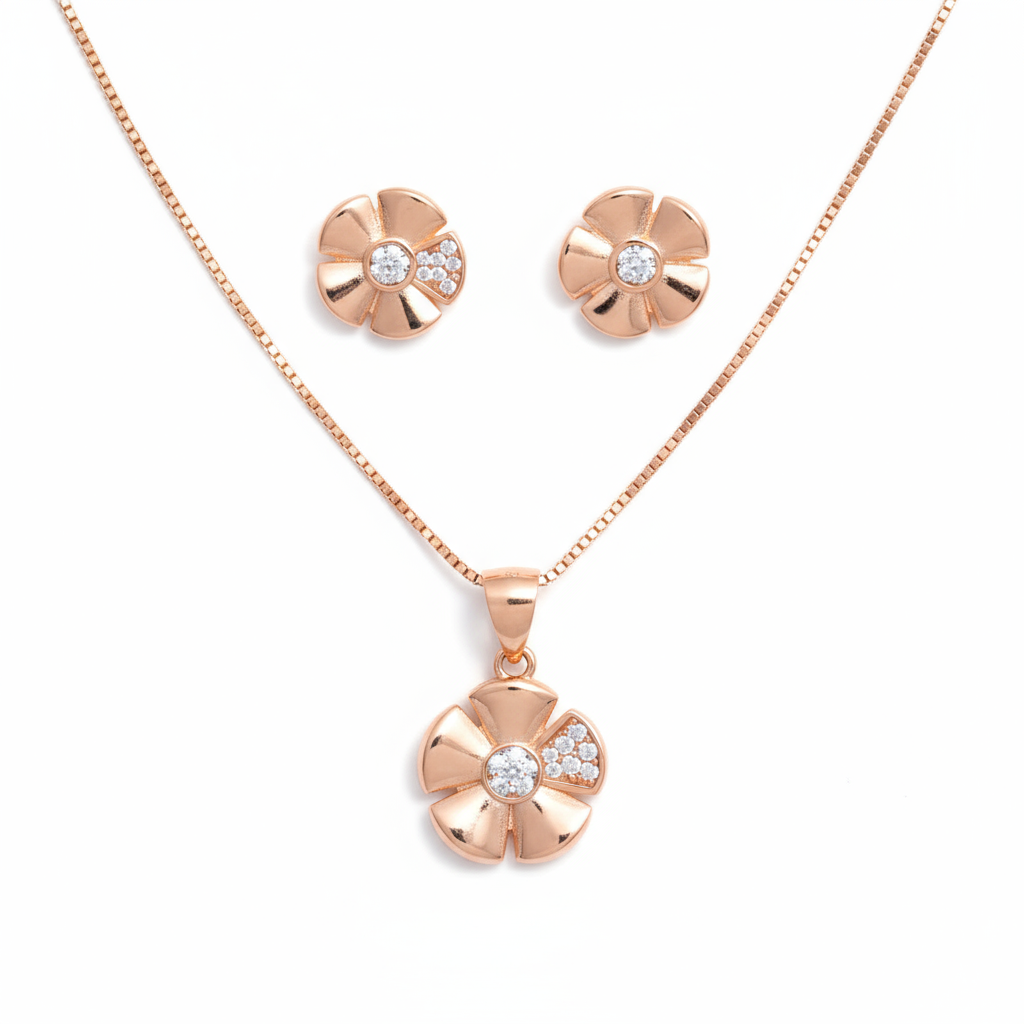 925 sterling silver rose gold pendant set with earrings and chain. Available in floral, heart, and geometric styles. Minimal yet striking—great for silver gifting.