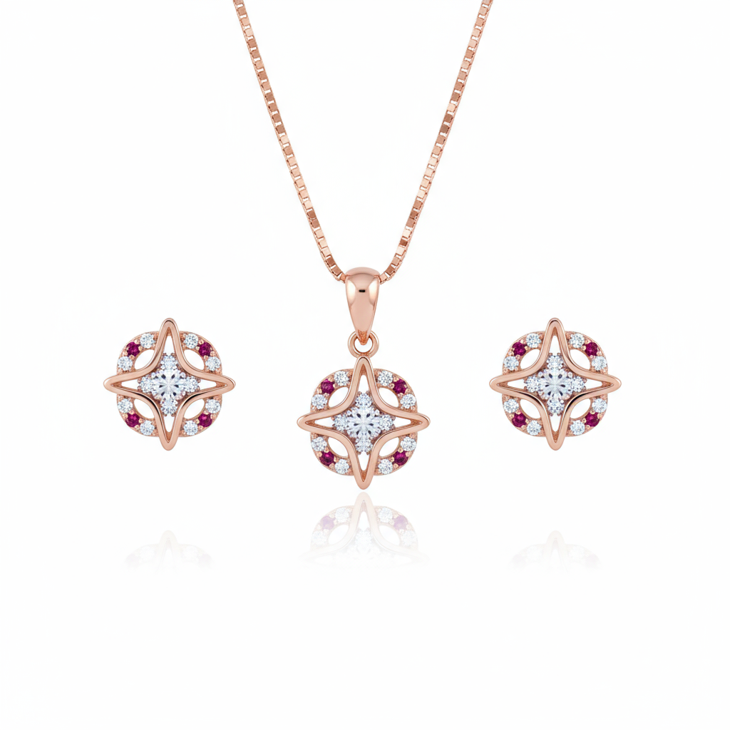 Star-shaped rose gold pendant and earring set with white and red stones. Ideal for weddings, occasions, and gifting.