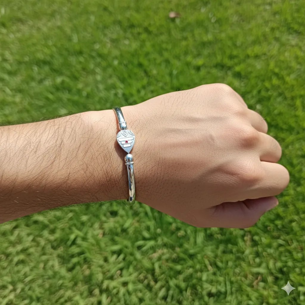 The rhodium finish enhances durability and prevents tarnish, making it perfect for daily wear or festive occasions. Designed as a unisex kada, it offers a comfortable fit and timeless look – ideal for devotees, spiritual gifting, or style-conscious wearers of silver jewelry.